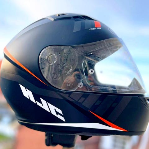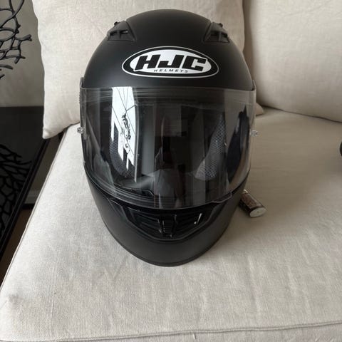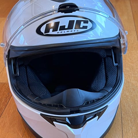 HJC helhjelm i hvit farge. Hjelmen har klart visir og integrert ventilasjon på topp og hakeparti. Innvendig polstring og hakereim med låsespenne. Egnet som motorsykkel- eller scooterhjelm. Størrelse M. Pent brukt og i god stand. Brukt 2 mopedsesonger av datter.
