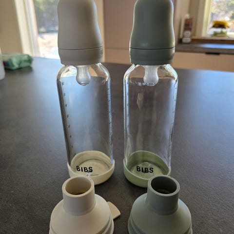 På nokon av flaskene begynner ml-målene å bli slitt bort, men er elles i god stand. Smokker til flaskene kan følge med, eller du kan kjøpe nye.