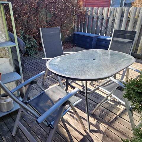 Hagebord og stablestoler i svart farge. Bordet har rektangulær bordplate og ben i metall eller lignende materiale egnet for utendørs bruk. Stolene er stablestoler med buet rygg og armlener, laget for å tåle bruk ute i hage, på terrasse eller balkong. Passer som enkel utegruppe til spiseplass eller sitteområde utendørs.