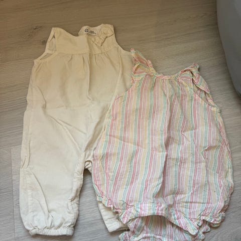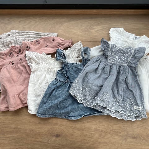 6 body, 1 bukse, 1 genser, 3 kjoler, 1 badetruse, 1 fleecedress, 1 foret dress med tilhørende votter. Merker fra Zara, Newbie, Kappahl, Lindex, Name it, H&M, Primark, Vrs Basis.