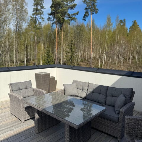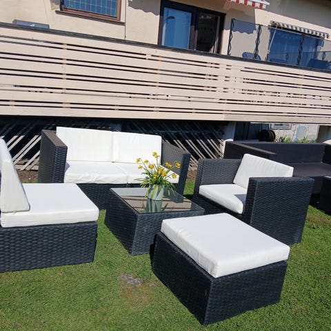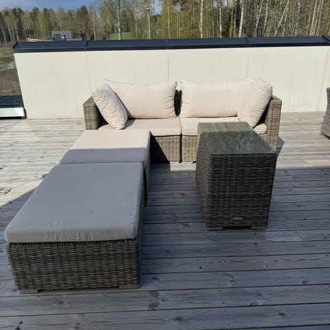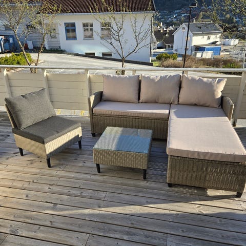 Hagegruppe bestående av to stoler, to fotskamler og ett sidebord med glasstopp. Putene har lysnet med årene, men sitteputene er fortsatt veldig fast og fin. Fikk noen oppbevaringsmerker iløpet av denne vinteren, men ikke synlig med puter og ingenting av petydning. Putene er lys grå.