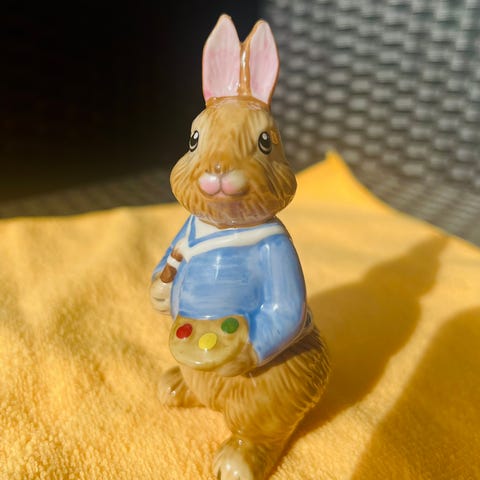 Samleobjekt i serien "Annual easter edition" 2016. Sjarmerende harepus som maler fargerike marihøner på et påskeegg, illustrasjonen er inspirert av gamle blikkleker.