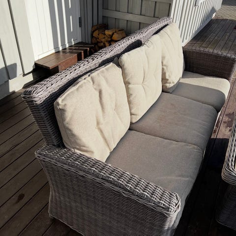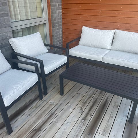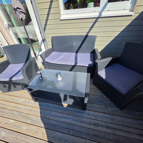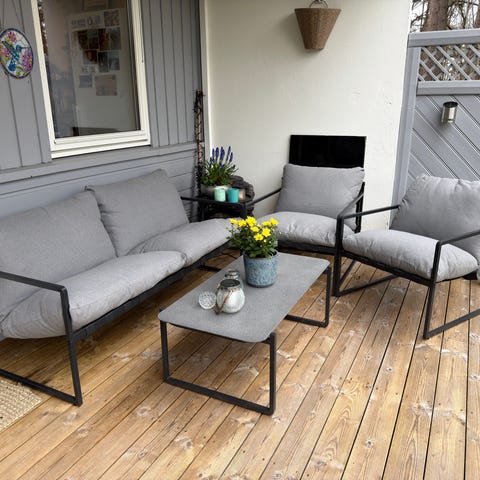 Hagegruppe bestående av en toseter sofa, to stoler og et rektangulært bord. Møblene har ramme i metall med rette linjer og armlener med innslag av tre. Setene leveres med grå puter. Bordet har mørk bordplate, trolig i glass. Passer til uteplass, terrasse eller balkong der det er behov for sittegruppe med bord til servering eller avlastning.