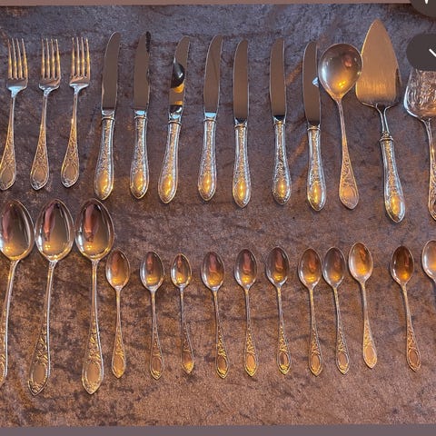 Forskjellige bestikksett i sølvplett. Settene består av ulike typer gafler og skjeer i flere mønstrede design. Det inkluderer både spisebestikk og serveringsdeler, som serveringsskjeer og serveringsspader.