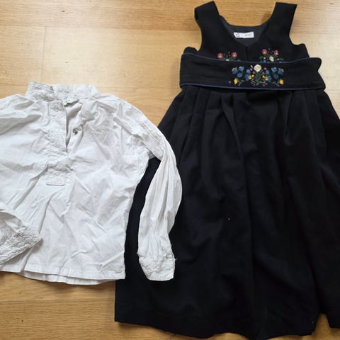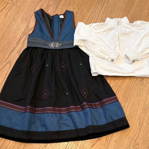 En helt super festdrakt med skjorte til jente i str 98 cm, 3 år. Både drakten og skjorta har fine forseggjorte detaljer. Beltet er løst og festes med borrelås, og er fleksibel ift størrelse. Safa ullstrømper i str 100 medfølger, disse er godt brukt men gjør seg godt under drakten når det blåser og er litt kaldt. Noen bruksmerker, generelt i god stand. En veldig fin drakt!