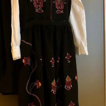 Bunad for jente i mørk blå farge med flerfargede blomsterbroderier på liv, belte og nederst på skjørtet. Kjolen har tradisjonelle hekter foran og bærestykke med kontrastfarge og broderier. Det følger med hvit bunadsskjorte med lange ermer og rysjer ved hals og mansjetter. Passer til bruk ved høytider og andre tradisjonelle anledninger.