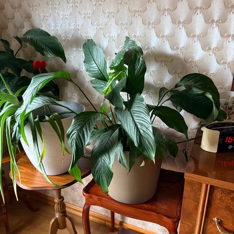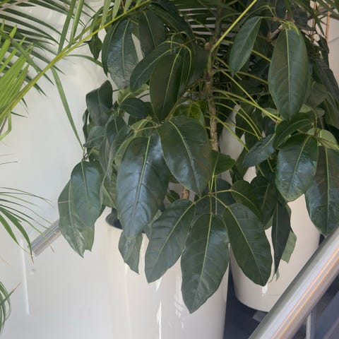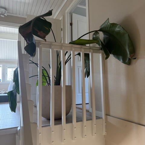 Stor grønn inneplante i potte. Planten har lange, brede blader og er plassert i en firkantet potte. Egner seg som dekorativ plante i stue, spisestue eller andre innendørs oppholdsrom. Krever lys plassering innendørs og jevnlig vanning etter behov. Pr nå er planten 250 cm høy.