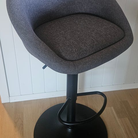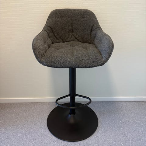 Barstol med stoppet sete. Mørkegrått stoff. Kan heves og senkes fra høyde 83 til 104cm.
