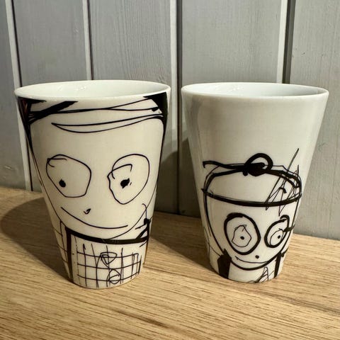 Aida Poul Pava krus i hvit porselen med sort, grafisk figurmotiv. Kruset har rette sider og passer til varme og kalde drikker. Designet er en del av Poul Pava-serien fra Aida, kjent for enkle, håndtegnede figurer i sort på hvit bakgrunn. Egner seg til bruk på kjøkken og spisebord i hverdagen. 2 kopper