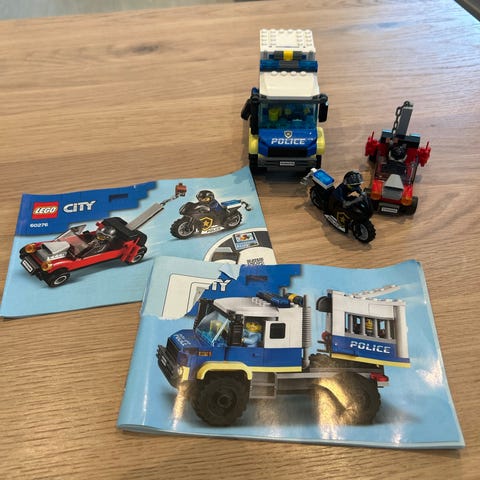 LEGO City lekesett med politibil og to motorsykler. Settet inkluderer en hvit politibil med blå detaljer, to motorsykler i ulike farger, flere minifigurer samt små tilbehør som rampe, søppelbøtte og brannhydrant. Egnet som byggesett og rollelek innenfor LEGO City-universet.