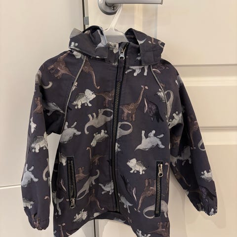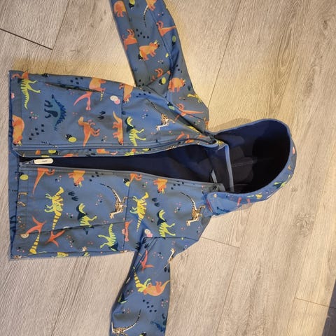 Softshelljakke med dinosaurmotiv i størrelse 116 fra Lindex. Jakken har avtakbar hette og elastikk ved ermeåpningene. Innsiden er fôret med mykt materiale. Aldri brukt.