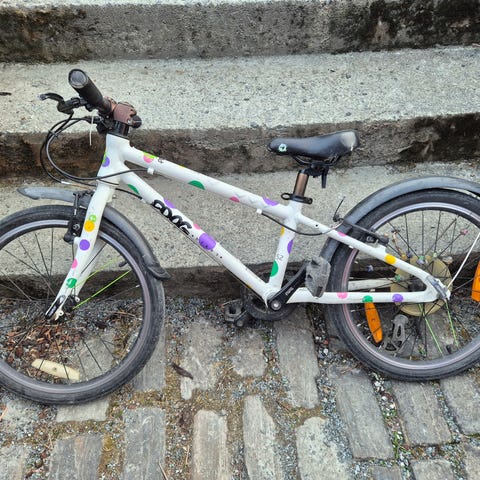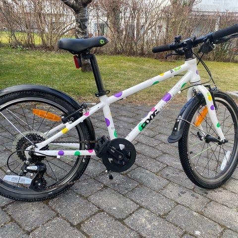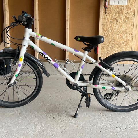 Pent Frog Bikes barnesykkel størrelse 55 med 20" hjul. Sykkelen har hvit ramme med fargede prikker og rette styre. Utstyrt med skjermer bak og foran og støtte. Egnet som barnesykkel for bruk på vei og lett grus for barn av 6/8 alder.