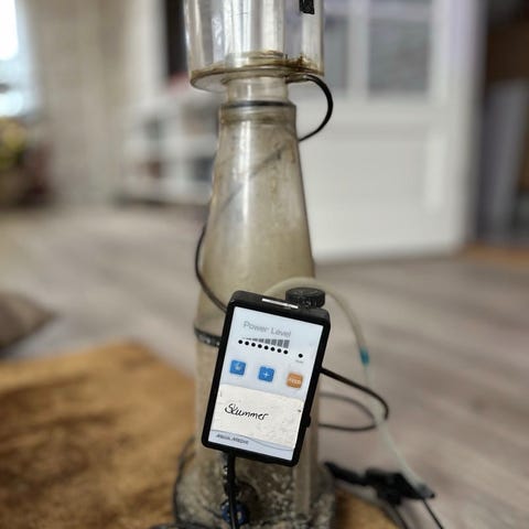 Meget effektiv og stillegående Deltec proteinskummer for bruk i saltvannsakvarium. Enheten er laget i gjennomsiktig plast/akryl med integrert pumpe og skumkopp på toppen. Skummeren er beregnet for plassering i sump eller direkte ved akvarium, og har tilkoblinger for luft og vann samt justeringsmuligheter for vannstand og skumnivå. Egner seg til filtrering og fjerning av organisk avfall i marine akvarier med fisk og koraller.