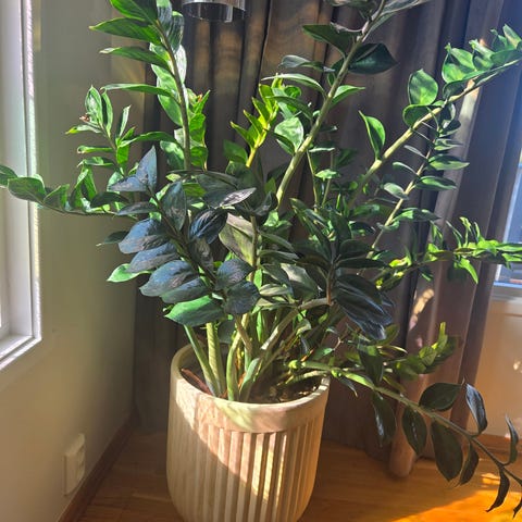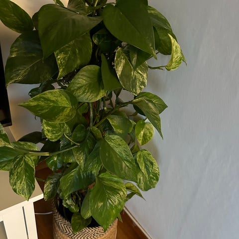 Grønn potteplante i dekorativ potte. Planten har runde, grønne blader og står i en strukturert potte som passer på kjøkkenbenk eller andre innendørs flater. Egnet som innendørs pynteplante i hjem eller på kontor.