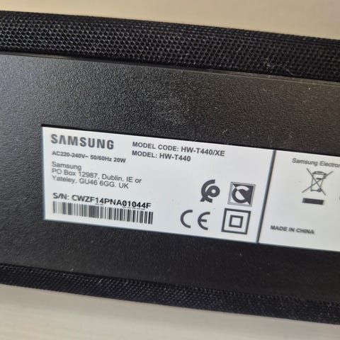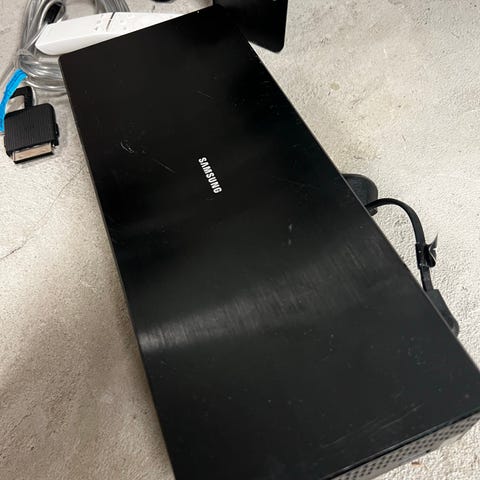 Samsung lydplanke med tilhørende subwoofer i svart.
