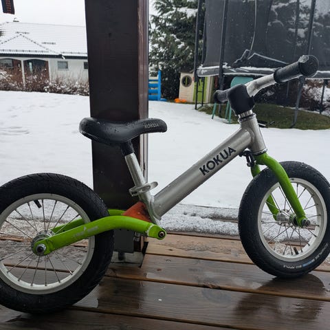 Kokua LIKEaBIKE Jumper løpesykkel med 12" hjul i sølv/rød. Grove dekk påmontert. Ekstra sett gatedekk medfølger. Setepinne med ekstra lengde medfølger. Originale plastforinger i svingarm er oppgradert til kulelager. Demper er skiftet ut og lite brukt i etterkant.