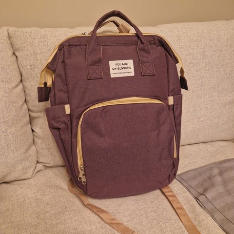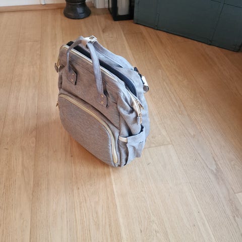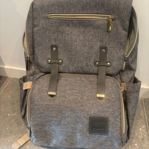 Sekken har frontlomme med glidelås, sidelommer og bærehåndtak på toppen. Egner seg til hverdagsbruk, skole, som stellesekk og på tur.