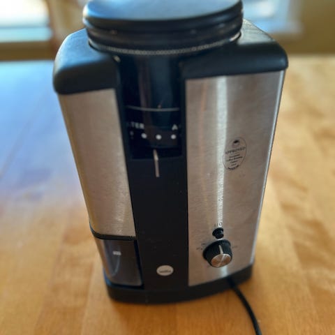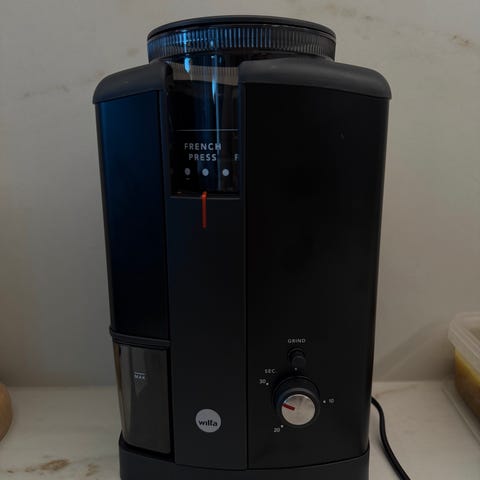 Beholderen i bunnen som den nymalte kaffen samles i, har et lite plastikkhengsel som er knekt. Se bilde. Merk at dette ikke har noe å si for funksjonen, men betyr at lokket ikke henger fast når man tar ut kaffen og skal helle den over i trakteren. Vi har aldri ansett dette som et problem, og lokket sitter fint på når man kverner. Fungerer ellers som den skal.