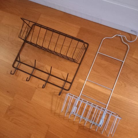 Dusjhylle i metall med to kurver. Hyllen henges over dusjvegg eller dusjdør og gir ekstra oppbevaringsplass til såpe, sjampo og andre baderomsartikler. Den har en øvre og en nedre kurv for organisering av ulike produkter. Nøytral farge som passer inn på de fleste bad.