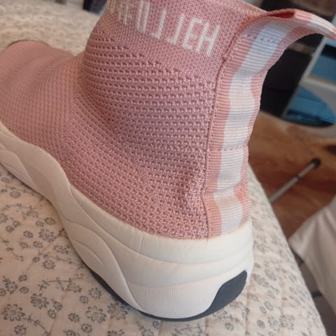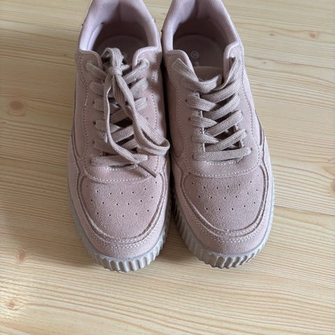 sneakers joggesko i størrelse 37. Modellen er i en lys beige/rosa farge med to borrelåsstropper over vristen. Overdel er semsket materiale, med gummisåle i matchende farge. Sålen har mønster for bedre grep. Egnet som hverdagssko i mildt vær. Nypris 700.