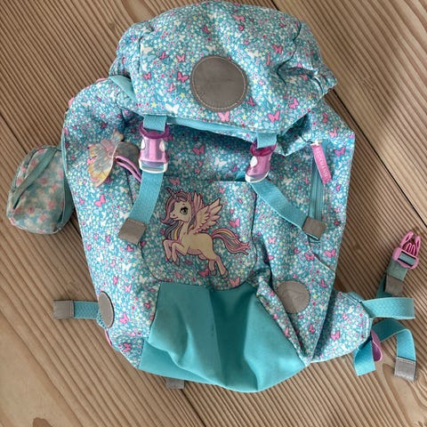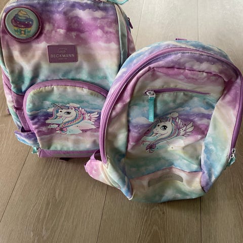 Pent brukt beckmann sekk med enhjørning stor plass inni og refleks som henger fast på toppen fine lommer på siden med masse plass enhjørning lommen framme har to lommer inni og et nøkkelknippe praktisk til husnøkkel følger også med bårrelås merker som du kan henge på to av fen er litt ødelagt men de fynker fint🦄