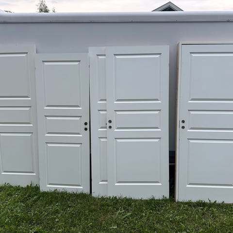 2 stk Swedoor innerdør med profilert design i hvit farge. Døren leveres sammen med tilhørende karmer/lister, som vist på bildene. Egnet som innvendig dør i bolig, for eksempel til soverom, stue eller gang. Kompakt dørblad med håndtak og låskasse montert. Noen bruksmerker forekommer.