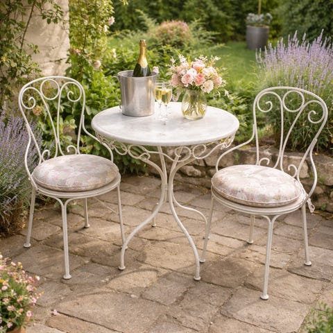 Fransk landstil, Provence, smijern, hagegruppe, vintage, antikk, hvitmalt jern, kafésett, romantisk hage, Shabby Chic, smijernsmøbler, hagebenk, uteplass, klassisk design, solid jern, sjel, patina.