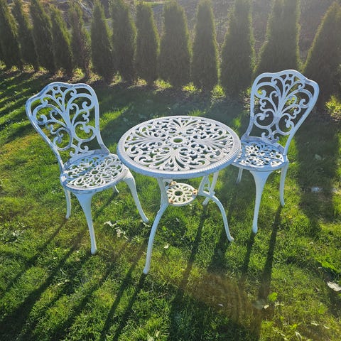 Dette er ikke en moderne kopi, men et solid vintage-sett i hvitmalt smijern som utstråler sjel, historie og tidløs eleganse.