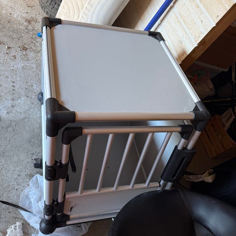 Enkelt hundebur til bil med aluminiumsramme og plater. Det følger med madrass og slitesterkt teppe. Buret har vært brukt i Volvo XC60, 2015 mod.