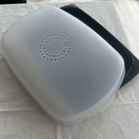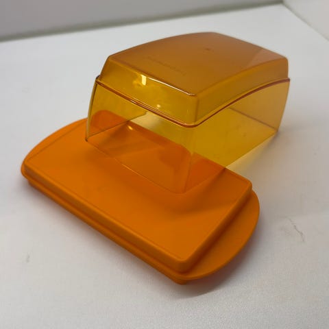 Tupperware osteboks liten versjon. Den hadde to ulike størrelser. Består av en firkantet beholder i lett transperant plast med struktur topp for å gjøre at man osten ikke “svetter”. tilhørende firkantet bunn-/lokkbrett i mørk plast. Egnet til oppbevaring av ost i kjøleskap. Kan også brukes ved servering. Laget i plastmateriale som er typisk for Tupperware-produkter.