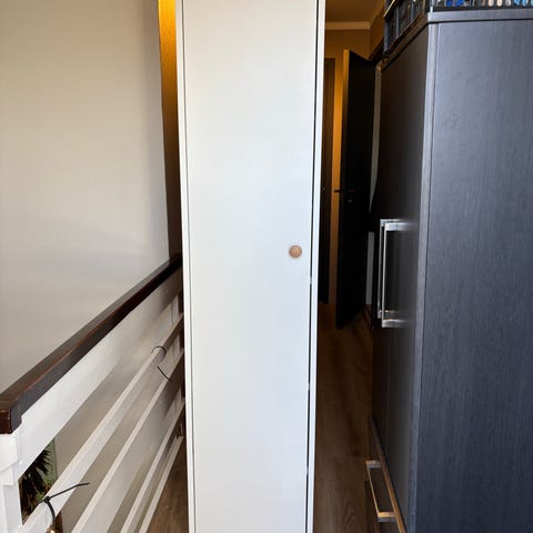 Gustavsberg høyskap til baderom i hvit glanset utførelse. Har kun stått lagret og ikke vært i bruk. Har delt inn med to skapdører, med glasshylle innvendig. Følger med håndtak.