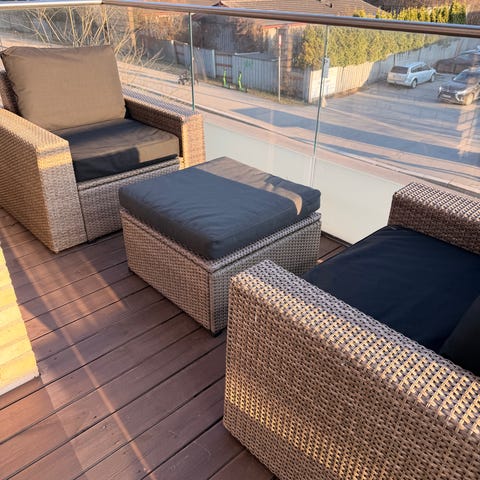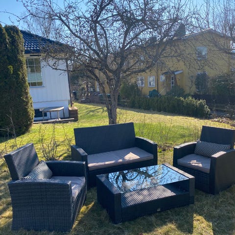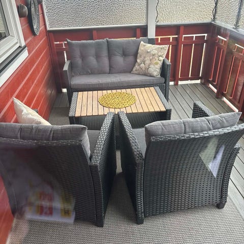 Loungesett med sofa, lenestol og bord i grå kunstrotting. Settet har lyse sitte- og ryggputer. Sofaen har rette armlener og plass til flere personer. Lenestolen har samme flettede kunstrotting og én sittepute og én ryggpute. Bordet er rektangulært med glassplate på toppen. Møblene er egnet for bruk på balkong, terrasse eller i hage. Kunstrotting er et syntetisk materiale som tåler utendørs bruk.