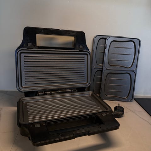Brukt. Synlig bruksslitasje og noe misfarging på stekeflatene.
