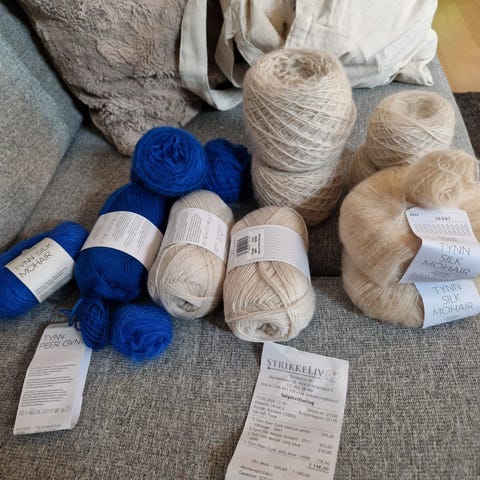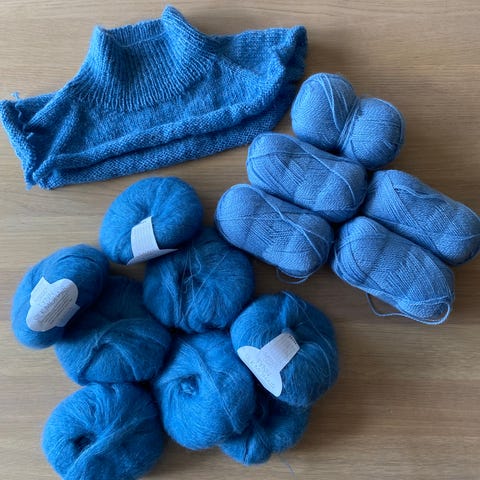 Nancy genser rundfelling uferdig strikkeprosjekt blå hvit alpakka