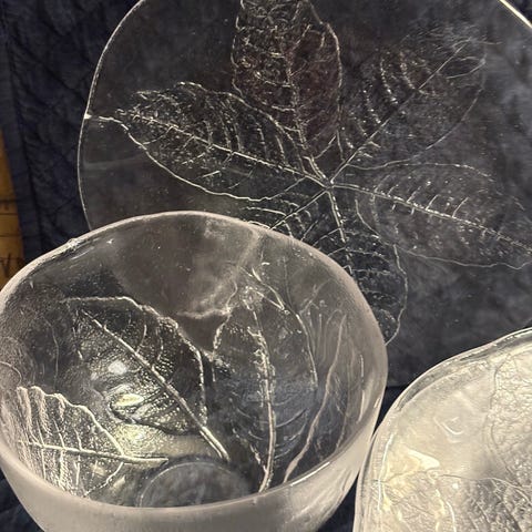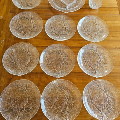Mener dette er Luminarc glasservise i klart glass med bladstruktur i overflaten. Serviset består av en stor punsjbolle, dessertskåler og kopper med hank. I tillegg kan du få med vi sett i god kvalitet. Alt lite brukt.