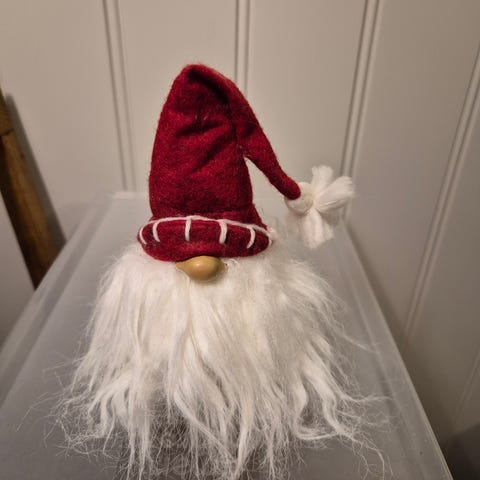 Nisse julefigur i tekstil med grå kropp, hvitt skjegg og rød høy lue. Figuren passer som julepynt på bord, hylle eller i vinduskarm. Egnet som innendørs dekorasjon i julen.