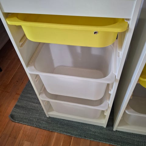 Gir oversiktlig sortering av og tilgang på innhold i hver kasse. Barnevennlig høyde på oppbevaringen gjør det enklere for barn å nå og holde orden på tingene.