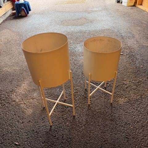 Sett med to blomsterpotter med stativ. Pottene er i beige farge og står i metallstativ med rund bunn og åpne sider. Én potte er lavere og én er høyere, noe som gjør dem egnet til å plassere sammen for å skape variasjon i høyde. Passer til innendørs bruk, for eksempel i stue, gang eller på innglasset balkong. Pottene kan brukes til ulike typer planter og gir stabil plassering gjennom stativene.fra skeidar