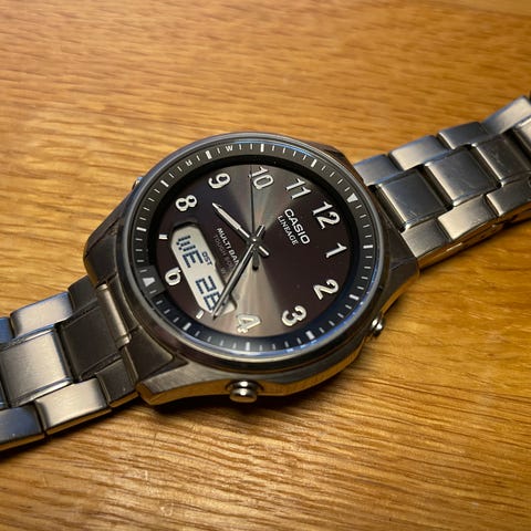 Casio herreklokke med analog og digital visning med lys. Klokken har oransj urskive med tydelige timemarkeringer og visere. Urkassen og lenken er i metall med leddet armbånd og foldespenne. Passer som hverdagsklokke til herre.