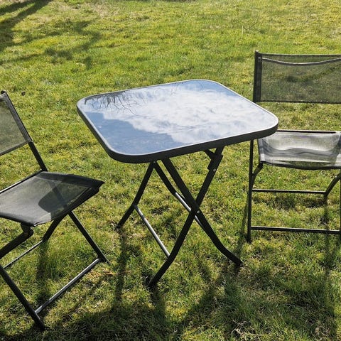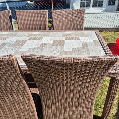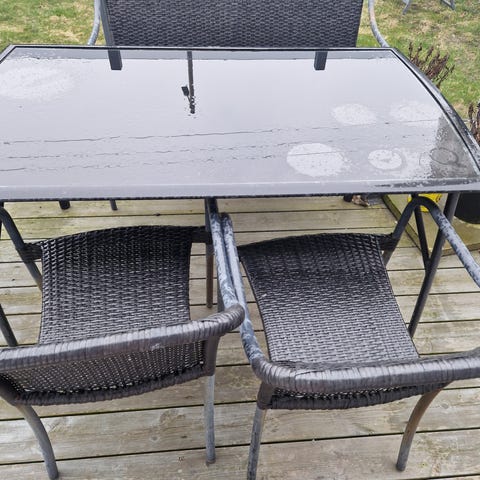 Hagemøbelsett spisegruppe med bord og 3 stoler i grå kunstrotting. Rektangulært bord med glassplate på toppen. Tilhørende 3 stoler med høy rygg og armlener, også i grå kunstrotting. Passer som spisegruppe på terrasse, balkong eller i hage. Følger med 4 stk puter til stolene med noe jordslag. Kan nok vaskes vekk😊