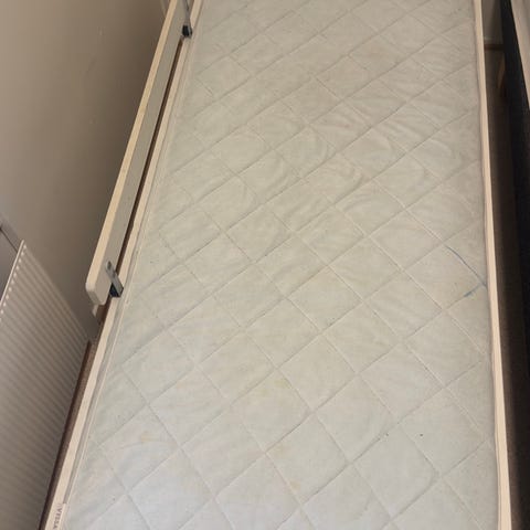 Barneseng 85x177cm. Pent brukt madrass kan følge med. Kan trenge litt maling noen steder.. Må hentes på Ulland utenfor Kongsberg.