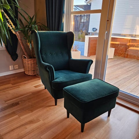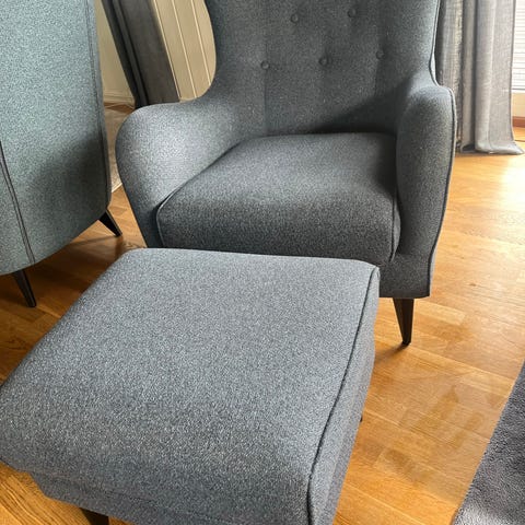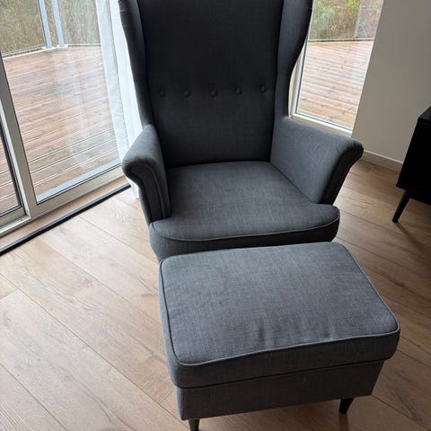 2 stk Ikea Strandmon ørelappstoler + en fotskammel. Ingen skader, men trenger kanskje en rens. Må hentes i Førresfjorden.