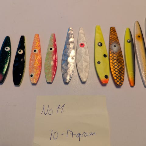Danske OGP gjennomløpere, meget bra sjøørret /ørretsluker. Kaster godt, beveger seg flaksende selv ved lav hastighet. Roterer meget godt ved spinnstop. Beste gjennomløpere jeg har prøvd. 10-17 gram på disse. Sendes etter kjøpers ønske, eller hentes i Hønefoss.