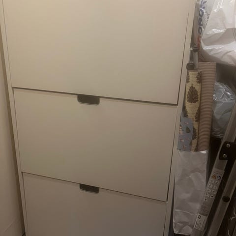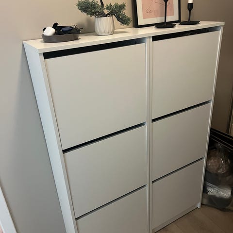 IKEA skoskap i hvit utførelse. Skapet har tre separate klaffer med håndtak i metall. Innvendig er det plass til organisering og oppbevaring av sko eller annet tilbehør i gangen. Egner seg for montering mot vegg i entré eller andre rom der det er behov for smal oppbevaringsløsning.