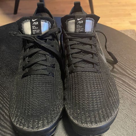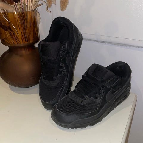 Nike Air Max joggesko i størrelse 43. Modellen har overdel i hovedsakelig tekstil og syntetisk materiale med svarte partier og hvite detaljer. Skoene har synlig Air-demping i hælen og kraftig gummisåle med mønster for grep. Passer som fritidssko og til hverdagsbruk.