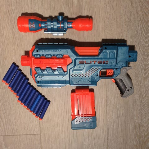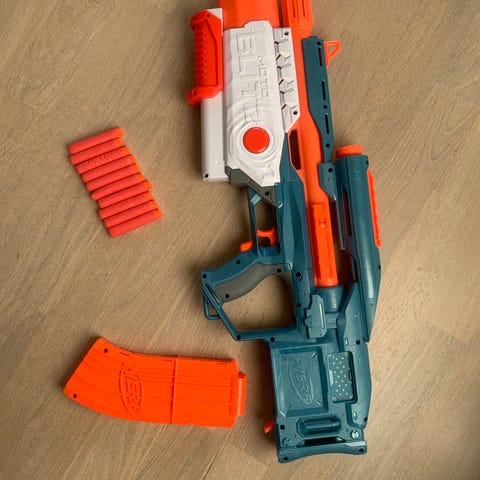 Nerf Elite 2.0 Phoenix nerf gun. Nerfen inkluderer pistolen, ett magasin og 11 Nerf-skumpiler i blå og oransje farge. Ikke vært brukt. Må hentes.