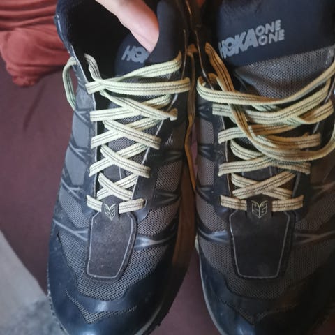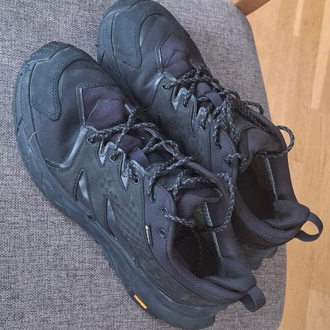 Hoka Speedgoat 5 tursko i størrelse 42. Modellen har mellomhøyt skaft og Gore-Tex-membran. Skoene er i en mørk, nesten svart farge med tekstil- og syntetisk overdel. Yttersålen har grovt mønster med Vibram-såle for godt grep på variert underlag. Egnet til tur og annen bruk der det er behov for stabile og vannavvisende sko.