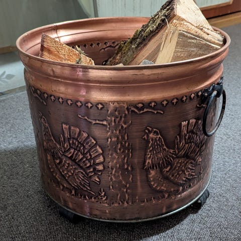 vedkurv, vedkjele, kobber, peis, hytte, interiør, dekor