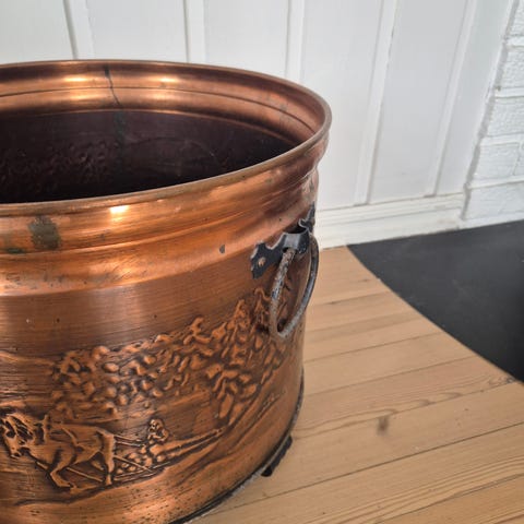 Stor kobber vedkurv / vedkjele med hjortemotiv