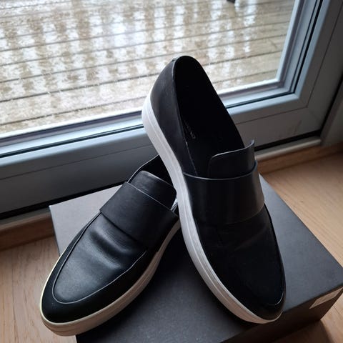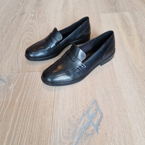 Vagabond mokkasiner i størrelse 40. Skoene er i svart skinn med klassisk mokkasinutforming og lav hæl. Innvendig såle er også i skinn med Vagabond-logo. Passer som hverdagssko eller til mer formelle anledninger der pene, enkle sko ønskes.